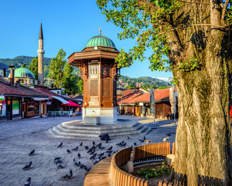 Sarajevo, capital of Bosnia and Herzegovina, is a compact city on the Miljacka River, surrounded by the Dinaric Alps. Its center has museums commemorating local history, including Sarajevo 1878–1918, which covers the 1914 assassination of Archduke Franz Ferdinand, an event that sparked World War I. Landmarks of the old quarter, Baščaršija, include the Ottoman-era Gazi Husrev-bey Mosque.