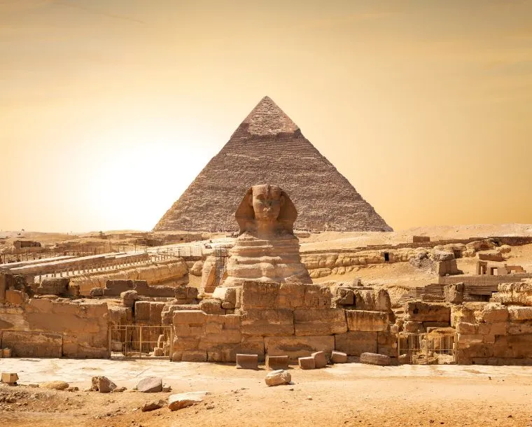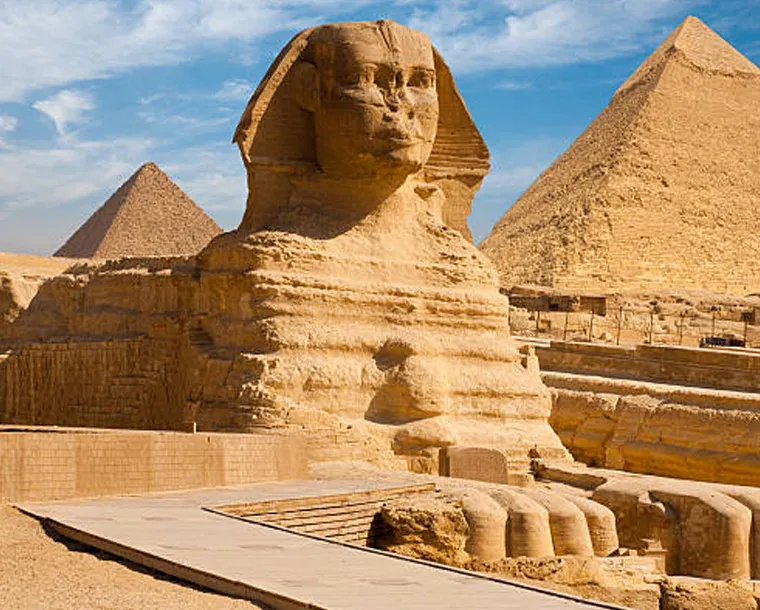 Giza is an Egyptian city on the west bank of the Nile, near Cairo. The Giza Plateau is home to iconic Egyptian monuments, including 3 tall pyramids built as royal mausoleums around the 26th century B.C. The largest, the Great Pyramid, is King Khufu’s tomb. The Great Sphinx is a vast sculpture of a man’s head on a lion’s body. The Solar Boat Museum displays a restored cedar barge found buried near the Great Pyramid.