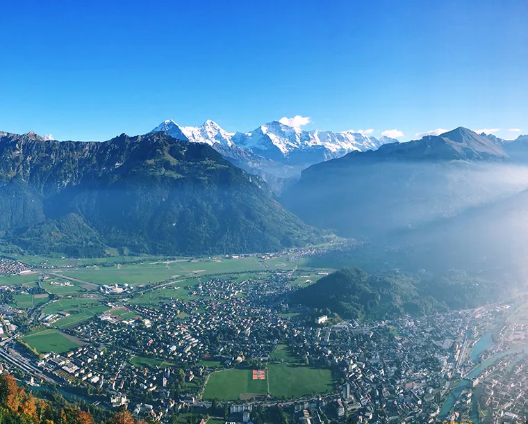 Interlaken is a traditional resort town in the mountainous Bernese Oberland region of central Switzerland. Built on a narrow stretch of valley, between the emerald-colored waters of Lake Thun and Lake Brienz, it has old timber houses and parkland on either side of the Aare River. Its surrounding mountains, with dense forests, alpine meadows and glaciers, has numerous hiking and skiing trails.