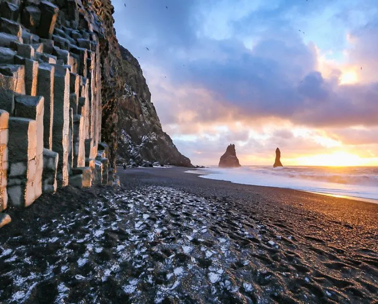 Vík í Mýrdal is a remote seafront village in south Iceland. It sits in the shadow of Mýrdalsjökull glacier, which covers the Katla volcano. Reyniskirkja is a wooden church dating to 1929. Reynisfjara beach has black pebbles, basalt columns and the Reynisdrangar offshore rock formations. The cliffs of Reynisfjall mountain are home to seabirds such as puffins. Just west, the Dyrhólaey peninsula has a large rock arch.