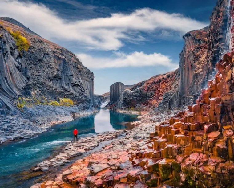Before heading back to Reykjavík, you will get the chance to explore the incredible western part of Iceland along beautiful Borgarfjörður. Your guide will stop at Deildartunguhver, the most powerful hot spring in Europe, the beautiful and the spectacular twin waterfalls of Hraunfossar and Barnafoss. Hraunfossar is a thrilling series of waterfalls that seemingly originating in a field without a river or lake. The water is actually streaming through rivulets in the Hallmundarhraun lava field. Meanwhile, Barnafoss is more like a series of rapids caused by the water of Hvitá entering a narrow passage. Next, you will be driven to the historical sites at Reykholt, which is rich in Saga history. Reykholt is the home of 13th century writer, poet and scholar Snorri Sturluson.