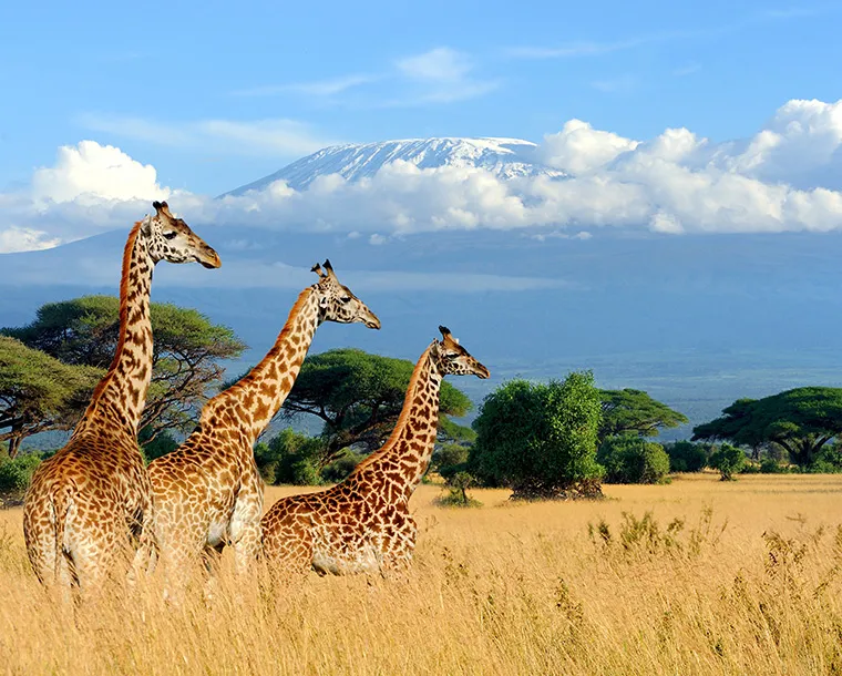 Kenya- is a country in East Africa with coastline on the Indian Ocean. It encompasses savannah, lakelands, the dramatic Great Rift Valley and mountain highlands. It's also home to wildlife like lions, elephants and rhinos. From Nairobi, the capital, safaris visit the Maasai Mara Reserve, known for its annual wildebeest migrations, and Amboseli National Park, offering views of Tanzania's 5,895m Mt. Kilimanjaro.