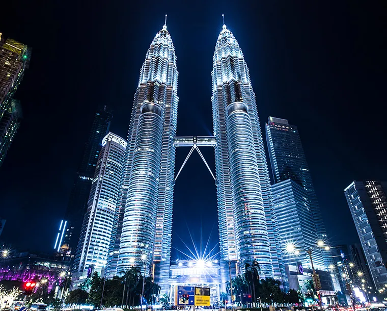 Kuala Lumpur is the capital of Malaysia. Its modern skyline is dominated by the 451m-tall Petronas Twin Towers, a pair of glass-and-steel-clad skyscrapers with Islamic motifs. The towers also offer a public skybridge and observation deck. The city is also home to British colonial-era landmarks such as the Kuala Lumpur Railway Station and the Sultan Abdul Samad Building.
