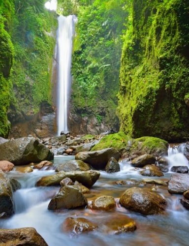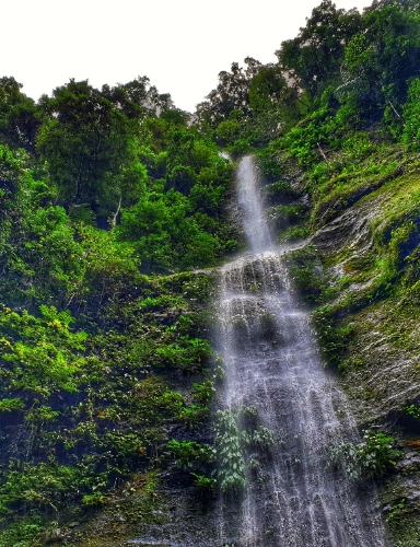 Pagsanjan Falls also known as Cavinti Falls (indigenous name: Magdapio Falls) is one of the most famous waterfalls in the Philippines. Located in the province of Laguna, the falls is one of the major tourist attractions of the region. The three-drop waterfall is reached by a river trip on dugout canoe, known locally as Shooting the rapids, originating from the municipality of Pagsanjan. The falls can also be reached from the top by a short hike from Cavinti. The boat ride has been an attraction since the Spanish Colonial Era with the oldest written account in 1894. The town of Pagsanjan lies at the confluence of two rivers, the Balanac River and the Bumbungan River (also known as the Pagsanjan River).