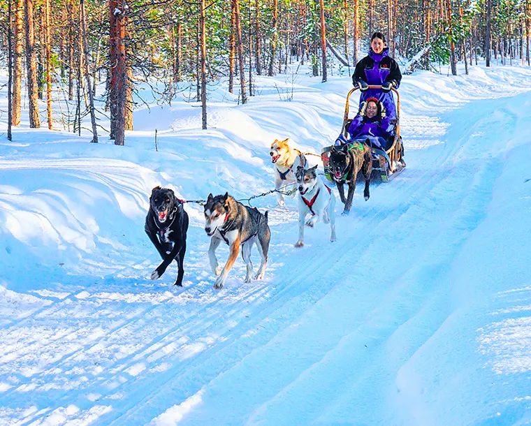 In the late afternoon you will be taken to the wilderness centre, Camp Tamok. There you will join a thrilling dog sledding tour into the white landscapes, through an uninhabited forest landscape surrounded by majestic mountains. After the tour you will have another opportunity to look for northern lights while enjoying dinner in a lavvu, a traditional Sami tent, at Camp Tamok, before being transferred back to your hotel.