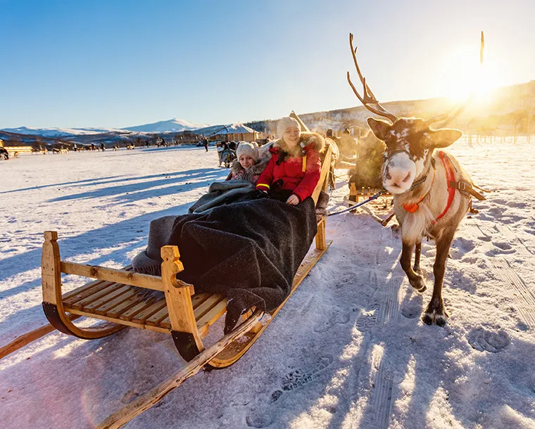 If you want a family-friendly adventure where you can learn about Sami culture and go reindeer sledding, don’t miss out on this excursion! You will first take a 75-min bus to Camp Tamok from where your adventure will begin. Here you’ll be provided with warm clothes before meeting the reindeer herd. You will be driving in pairs with one reindeer pulling each sleigh. All you need to do is make yourself comfortable, sit back and enjoy the magical scenery. After the sledding, you’ll warm up over a bonfire in the cosy lavvo (Sami tent), where you will learn more about Sami people, their culture and history. Later you’ll also be able to feed the reindeer and try the lasso-throwing method that Sami people use to catch reindeer when they are rounded up for marking. The adventure ends with a hot meal in the dining lavvu, before returning to Tromsø.