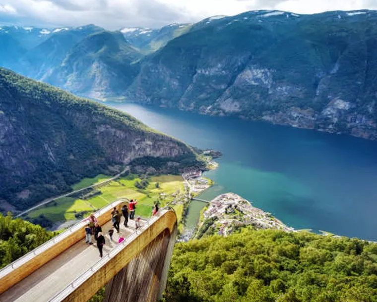 Flåm is a village in southwestern Norway, in an area known for its fjords. It sits at the end of Aurlandsfjord, a branch of the vast Sognefjord. The dramatic Stegastein viewing platform juts out high above the Aurlandsfjord. South of Flåm Harbor, the 17th-century wooden Flåm Church lies in the valley. The Flåm Railway offers valley and waterfall views as it climbs to a station on the Hardangervidda plateau.