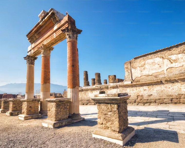 Pompeii a vast archaeological site in southern Italy’s Campania region, near the coast of the Bay of Naples. Once a thriving and sophisticated Roman city, Pompeii was buried under meters of ash and pumice after the catastrophic eruption of Mount Vesuvius in 79 A.D. The preserved site features excavated ruins of streets and houses that visitors can freely explore.