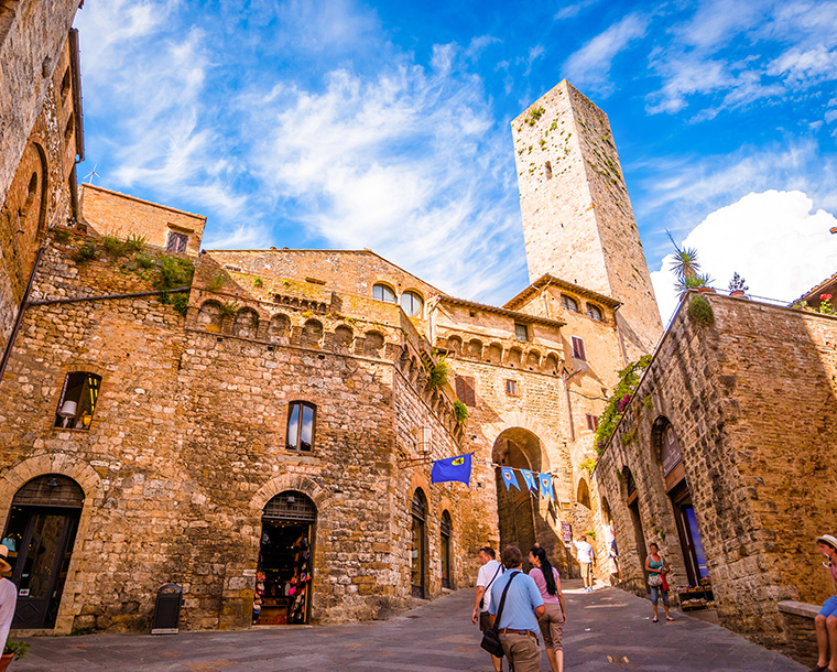 Discover the rich history, glorious scenery, delicious produce, and stunning art of Tuscany all in one day with an unforgettable tour of the region. Take in the beauty of Tuscany as you tour the region’s most breath-taking villages and picturesque countryside’s and savour a delicious homemade lunch prepared using the finest fresh local products in a traditional Tuscan farm accompanied with a selection of exquisite wines from the region’s many vineyards. Head for Siena, one of Italy’s prettiest cities, and admire its small medieval streets, tiled roofs and open courtyards. Follow your guide through Siena’s winding pathways, where you will see the oldest bank in the world, the intricate cathedral and the Piazza del Campo, home to the famous 600-year-old Palio horse race. From Siena drive into the rolling hills of the Tuscan countryside to enjoy a delicious lunch at a local farm, including handmade pasta and cured meats, salad and typical local cheese, all served with the best wine from the region. Sample Vernaccia, Chianti and Vin Santo before moving on to one of Tuscany’s famous wine towns, San Gimignano. Admire the tall, narrow towers of San Gimignano’s town centre, often nicknamed the “Manhattan of the Middle Ages” due to its medieval skyline representing a modern city. Explore its cobbled stone streets, charming squares and browse the many local craftsmen’s shops along its charming streets. Make your way past scattered hilltop hamlets and little churches on your way to the final stop of the tour, Pisa. Discover its “Field of Miracles” where the green grass contrasts with the majestic white of the Duomo, the Baptistery and of course the iconic Leaning Tower.