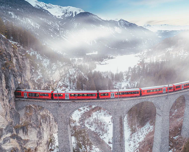 After breakfast, check out and make your way to the train station and board the Glacier Express and enjoy one of the greatest rail journeys in the world. An 8 hour rail journey takes you across 291 bridges, through 91 tunnels and across the Oberalp Pass at 2033 m to St. Moritz. On arrival to St. Moritz proceed to your hotel and check in.