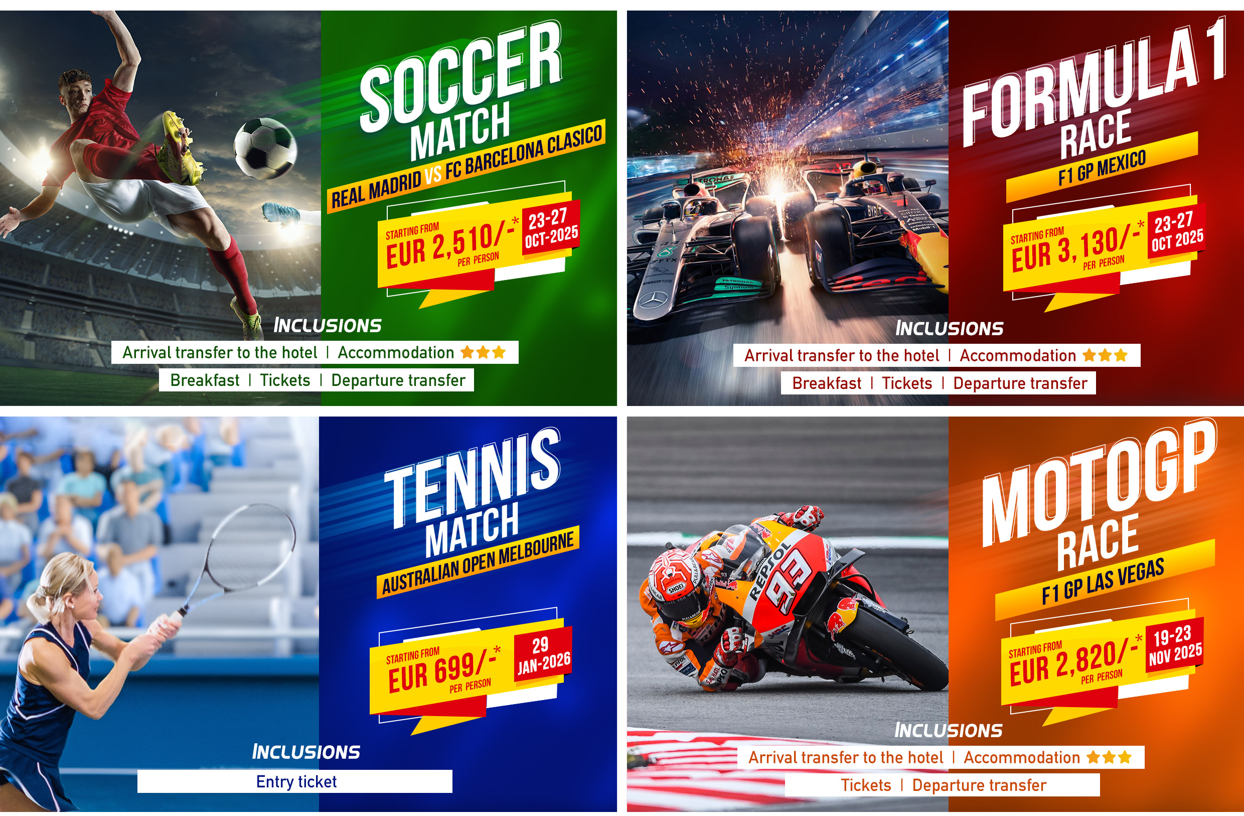 Feel the adrenaline rush of world-class motorcycle racing with Al Tayer Holidays Grand- prix packages. Travel to iconic circuits around the globe — from Qatar to Mugello — and witness high-speed action, fierce rivalries, and engineering excellence up close. Enjoy premium grandstand seating, pit lane access, and behind-the-scenes tours for a truly immersive motorsport adventure. Whether you’re a die-hard racing fan or a thrill- seeking traveller, MotoGP offers an unforgettable blend of sport, speed, and global travel.